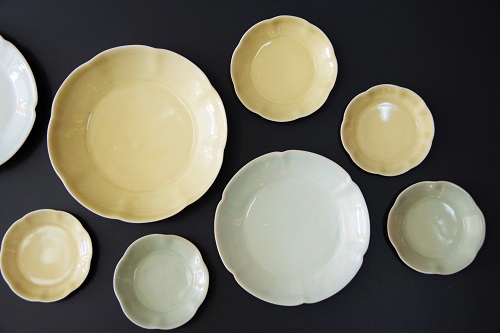 青白磁、青磁の他にも、今回初めて届く黄色の器もございます。輪花のお皿は、色味によってフリルの数も若干異なります。